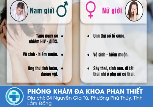 Gây ung thư: Các bệnh hoa liễu nếu không được phát hiện và chữa trị hiệu quả sẽ có nguy cơ gây ung thư dương vật, cổ tử cung, hậu môn – trực tràng,... Đặc biệt là bệnh sùi mào gà khi mắc HPV tuýp 16 hoặc 18.