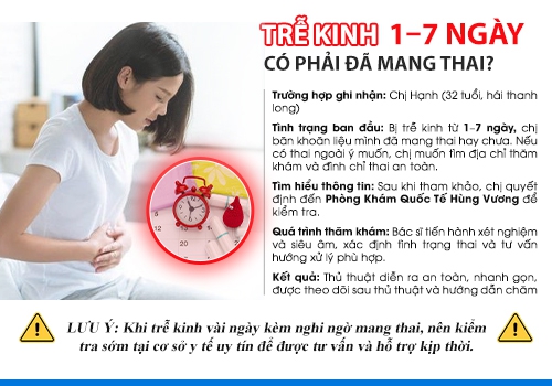 Trễ kinh 1–7 ngày có thể là dấu hiệu mang thai. Nếu lỡ mang thai ngoài ý muốn, hãy bình tĩnh và tìm đến cơ sở chuyên khoa uy tín như Phòng Khám Đa Khoa Quốc Tế Hùng Vương hoặc liên hệ qua 0252.7303.888 để được tư vấn và hỗ trợ an toàn.