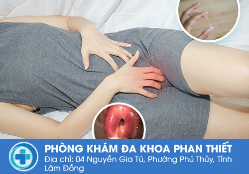++ Niêm mạc âm đạo viêm đỏ, dễ nứt, chảy máu, có khí hư bột trắng như váng sữa bám vào. Tổn thương có xu hướng lan ra bẹn, mông biểu hiện bằng các mụn nước sờ thấy sần sần.