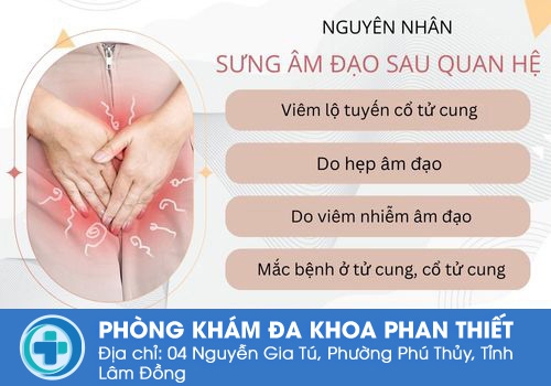 Sưng âm đạo sau quan hệ do tình trạng viêm nhiễm vùng kín gây ra là trường hợp rất dễ bắt gặp. Trong môi trường dễ lây bệnh như đường sinh dục, khả năng tiếp xúc với vi khuẩn, tạp khuẩn, nấm rất cao. Một số bệnh đó có thể là: Viêm âm đạo, nấm âm đạo, viêm cổ tử cung,…